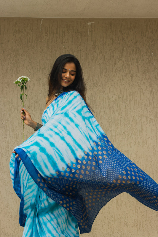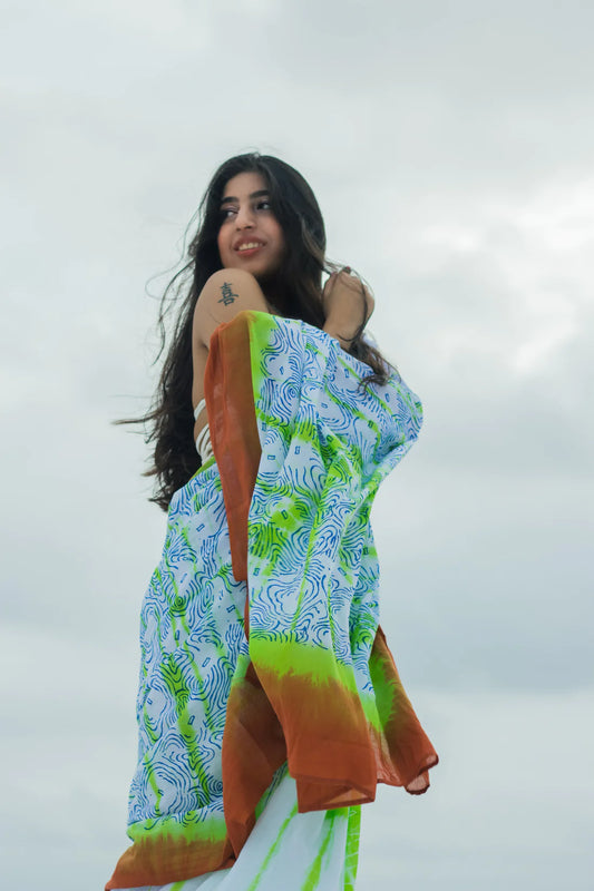 Linen Cotton Bagru Saree Rustic Waves