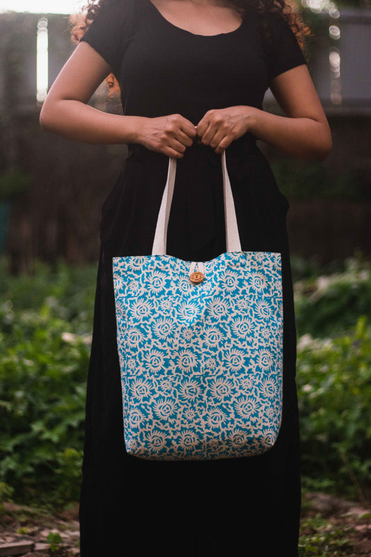 Cotton Shopping Tote Bag · Floral Fun Blue