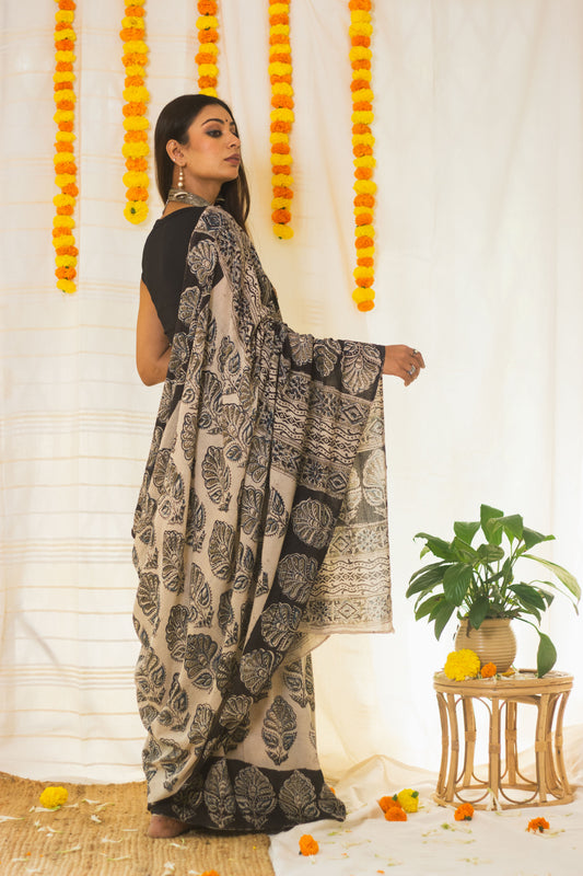 Mul Cotton Block Printed Saree Kalamkari Moonlit Florals