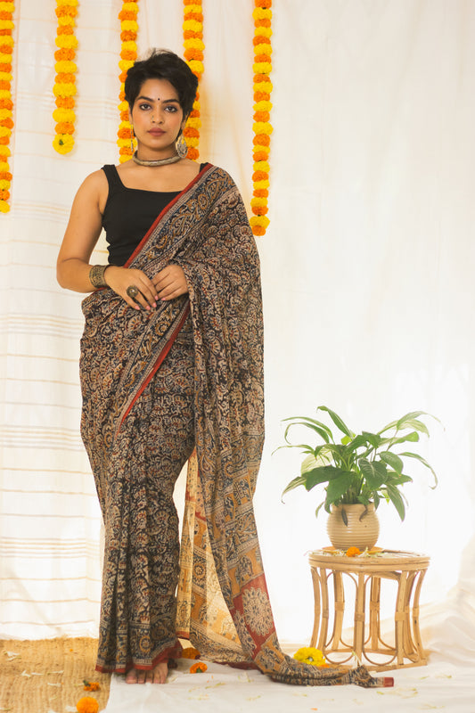 Mul Cotton Block Printed Saree Kalamkari Midnight Magic