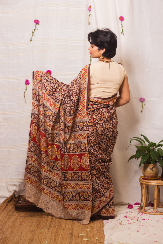 Mul Cotton Block Printed Saree • Kalamkari Maroon Paisley
