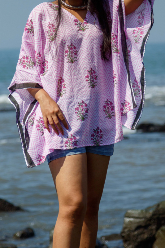 Hand Block Printed and Hand Painted Cotton Mul Kaftan · Pink Chevron