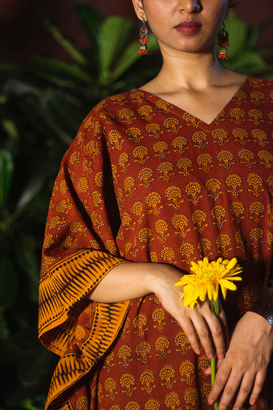 Cotton Bagh Block-Printed Long Maxi Kaftan · Palash Mustard