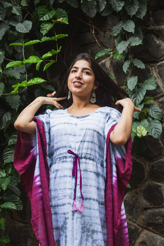 Cotton Mulmul Tie Dye Kaftan Dress · Wine in Steel