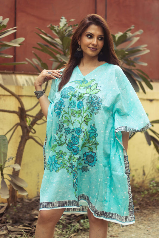 Hand Block Printed and Hand Painted Cotton Mul Kaftan · Teal Tree Of Life