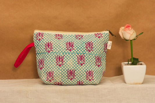 Cotton Pouch • Teal and Pink • Lotus Motif