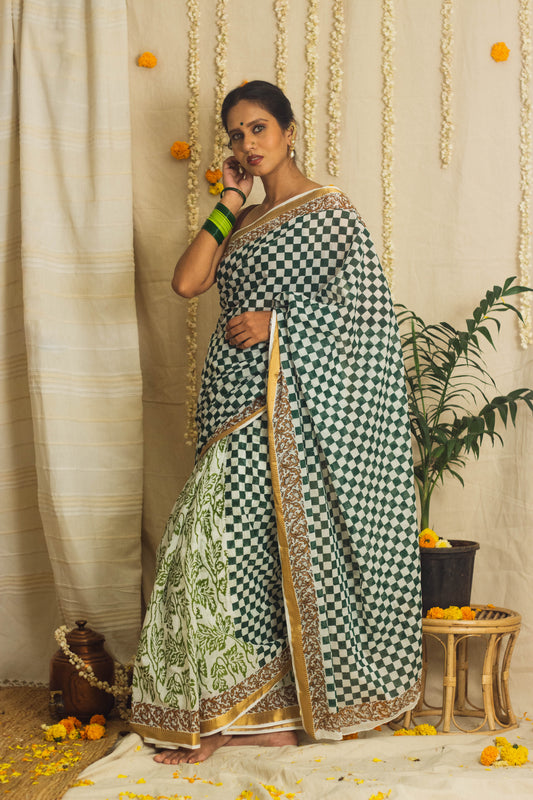 Mul Cotton Block Printed Saree Kalamkari Aztec